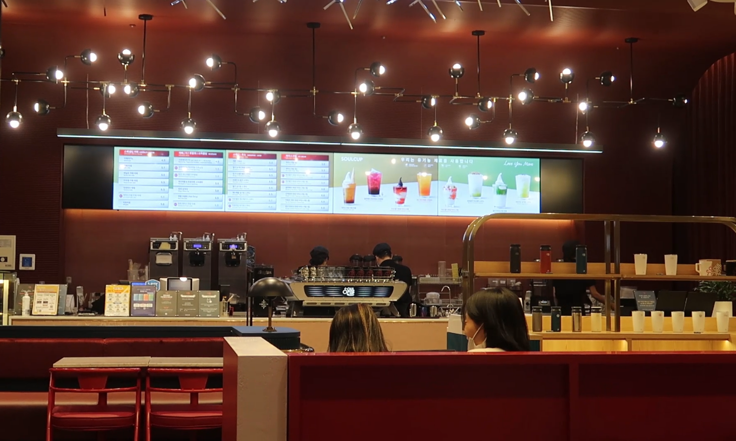 Il y a un écran géant qui fait tout un mur du café qui diffuse en continu les MVs des groupes de l'agence. Malheureusement, GOT7 n'en fait plus partie mais si vous êtes fans de Twice, Stay Kids, 2PM, Day6, ITZY, Niziu et Xdinary Heroes, vous serez servis. L'ambiance y est vraiment sympa avec ce fond musical.